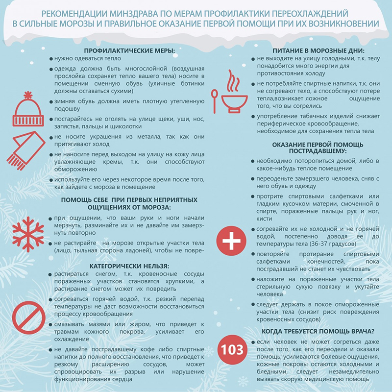 Рекомендации Минздрава по мерам профилактики переохлаждений в сильные морозы и правильное оказание первой помощи при их возникновении