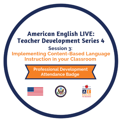 Attendance of one-hour online live professional development event hosted by American English for Educators and presented by an English Language Specialist. This event was entitled "Implementing Content-based Language Instruction in Your Classroom."