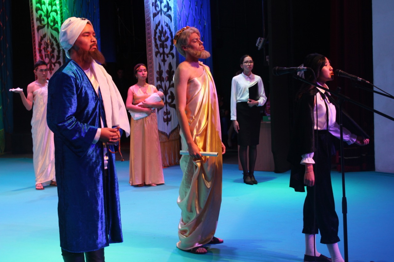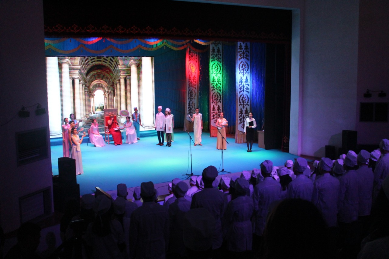 Әрине, бұл шараны театрландырылған қойылымсыз өткізу мүмкін емес: Эскулап - медицина өнерінің құдайы, шәкірттерімен студенттер қатарына қабылдау рәсімін өткізсе, ал медицина әкесі Гиппократ бірінші курс студенттеріне өз батасын берді.