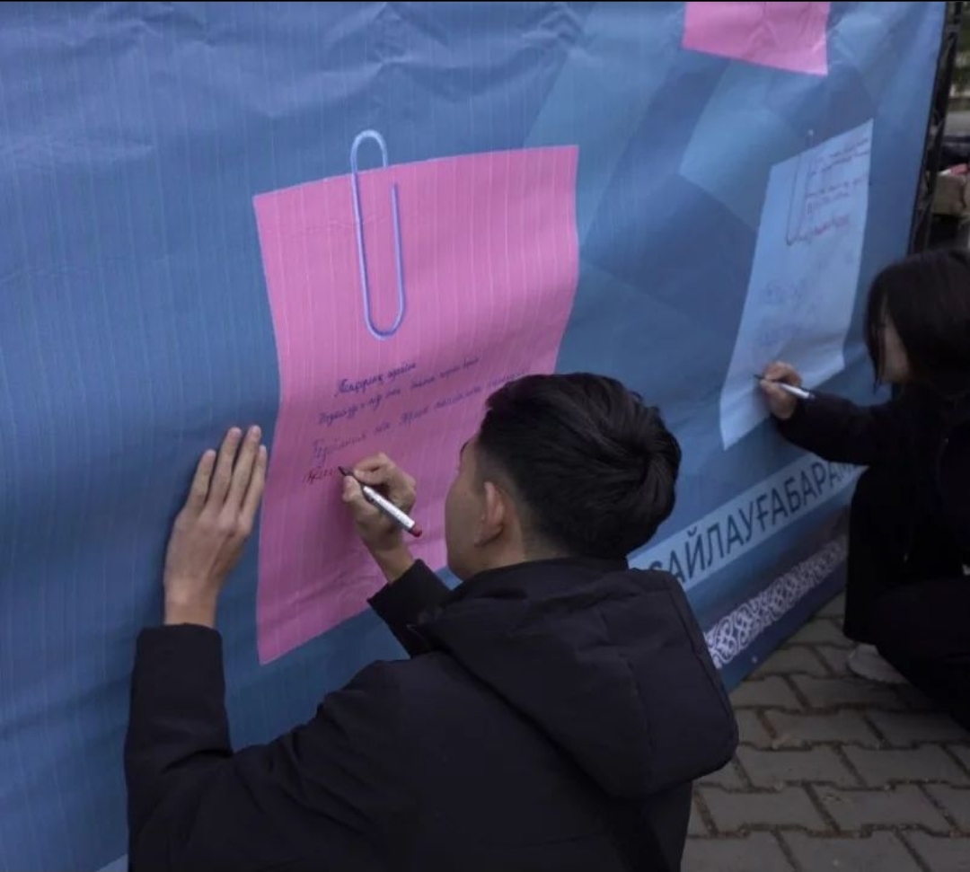 На стикерах на баннере, выставленном в ходе акции, были написаны предложения и мнения горожан, всем жителям было предложено принять участие во внеочередных выборах Президента РК 20 ноября и проголосовать за свое будущее.
