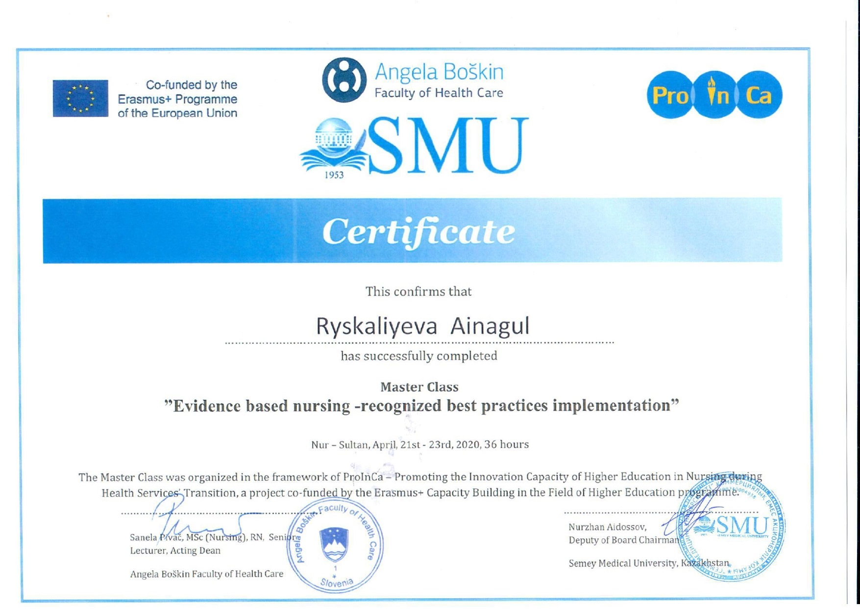 С 21 по 23 апреля 2020 года в НАО «МУС» прошёл международный онлайн мастер-класс «Доказательное сестринское дело-внедрение наилучших мировых практик» на платформе Zoom, в рамках проекта «Содействие инновационному потенциалу высшего сестринского образования через реформирование здравоохранения» ProInCa софинансируемого программой европейского союза Erasmus+, в котором приняла участие преподаватель дисциплины «Основы сестринского дела» Рыскалиева А.С.
