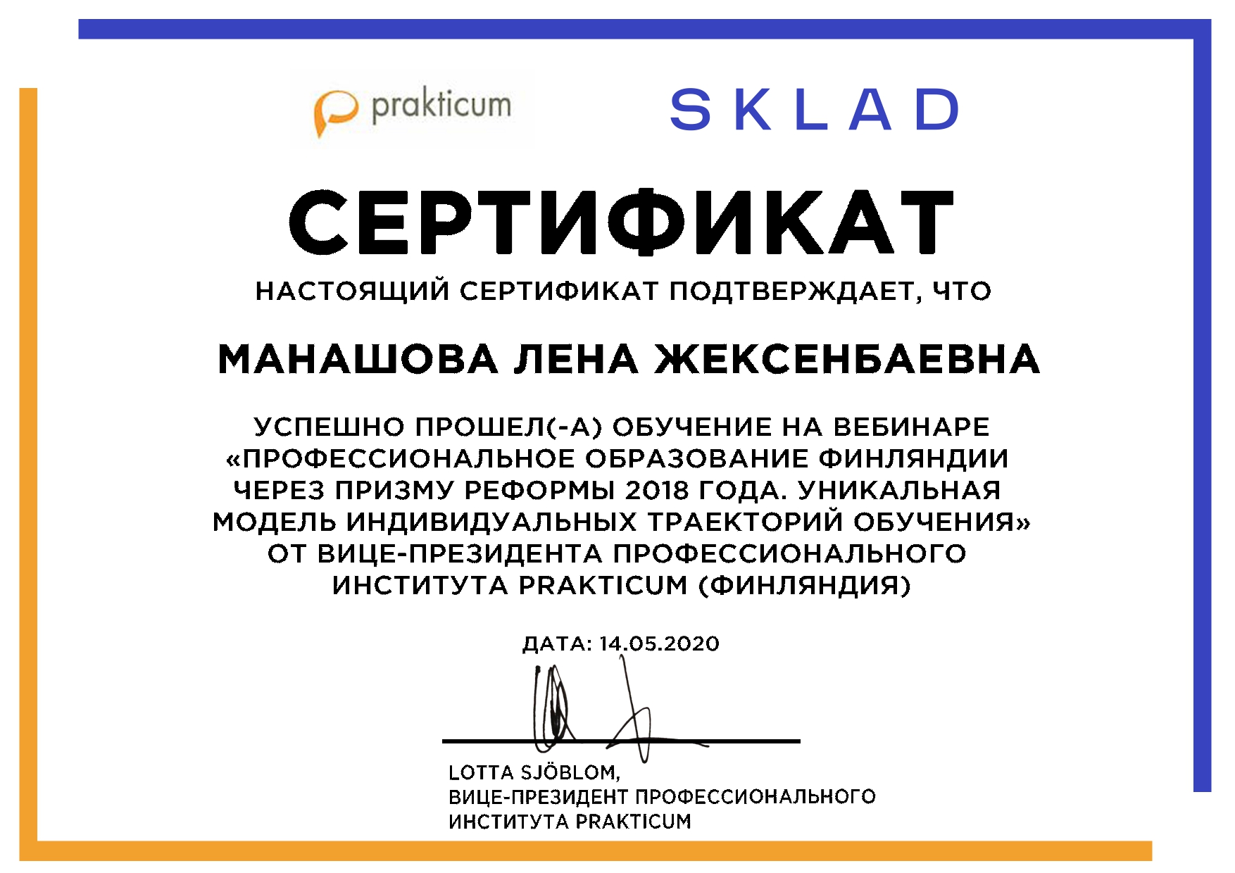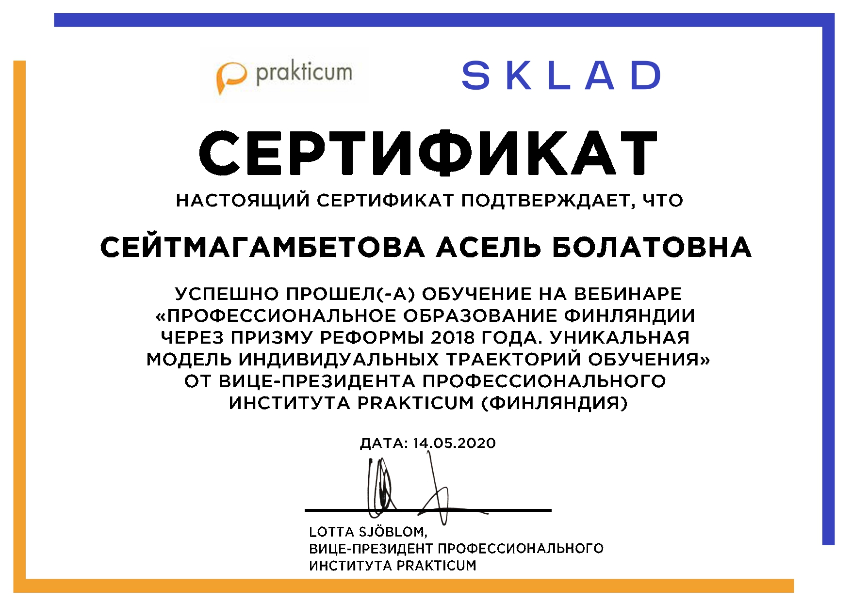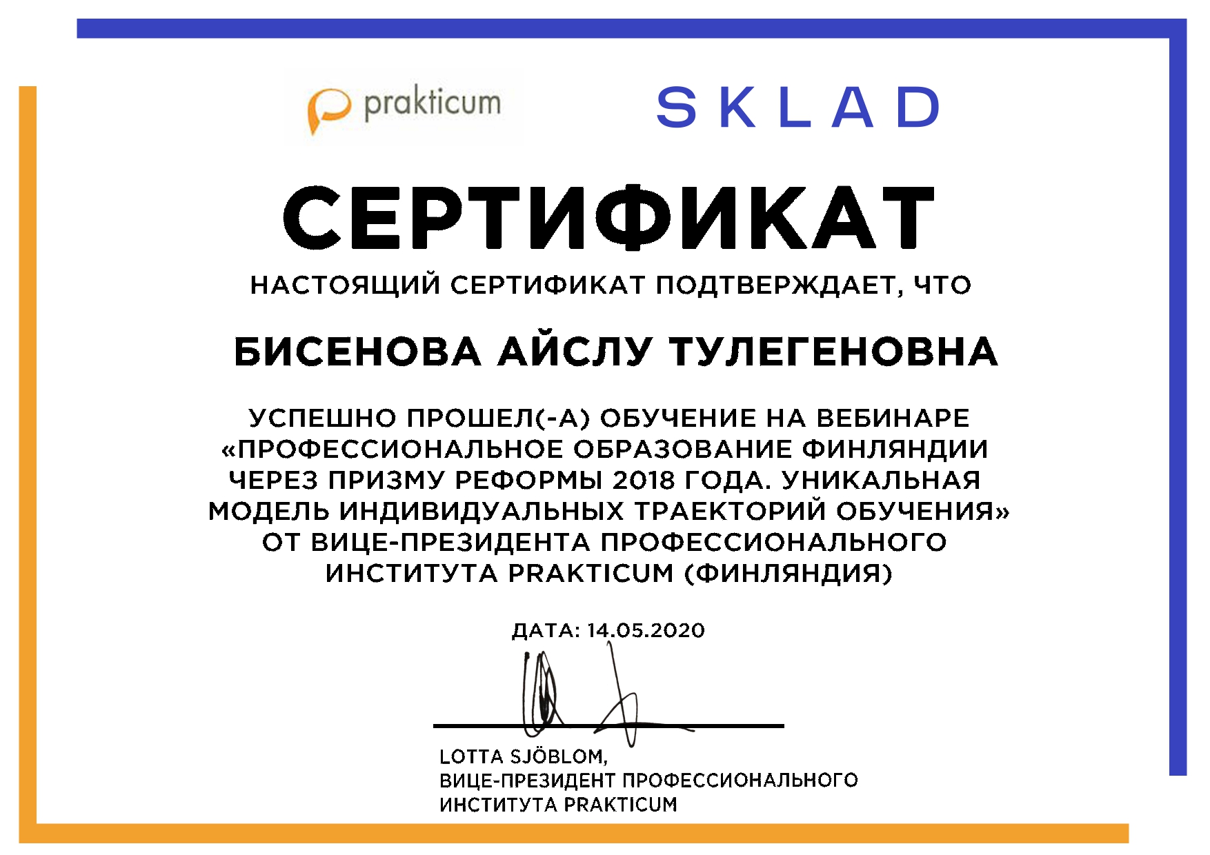 Агенство Международных образовательных программ «Эду Трэвел», Образовательная платформа SKLAD 14 мая 2020г. провела вебинар на тему: «Профессиональное образование Финляндии через призму реформы 2018 года. Уникальная модель индивидуальных траекторий обучения», в котором приняли участие преподаватели колледжа: Балабанова Н.А., Сулейменова Д.Ж., Коптлеу А.Б., Дикун Е.В., Сейтмагамбетова А.Б., Манашова Л.Ж., Коцелл С.О., Медеубекова А.О., Зверховская О.А., Бисенова А.Т.Участники вебинара получили сертификаты.