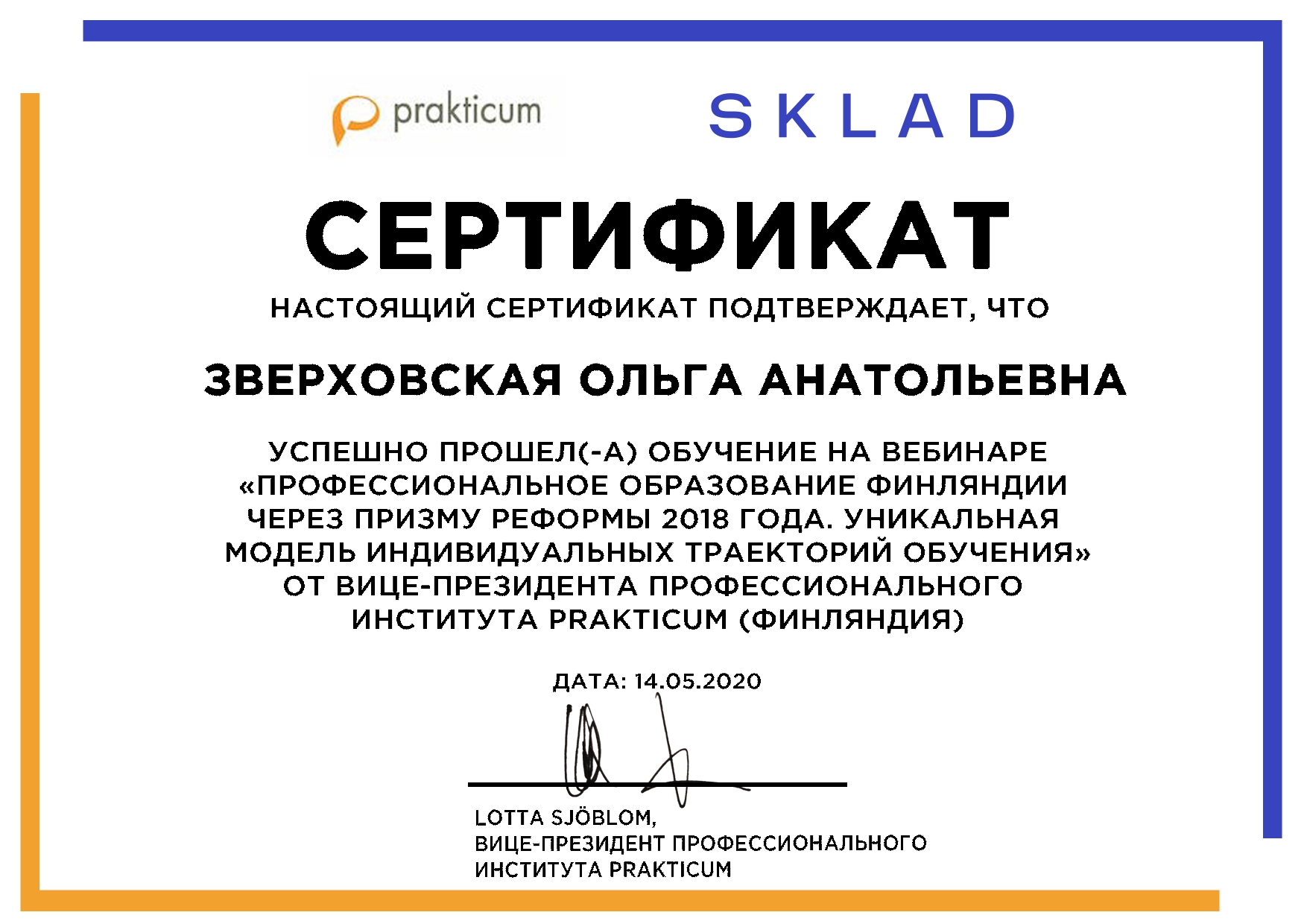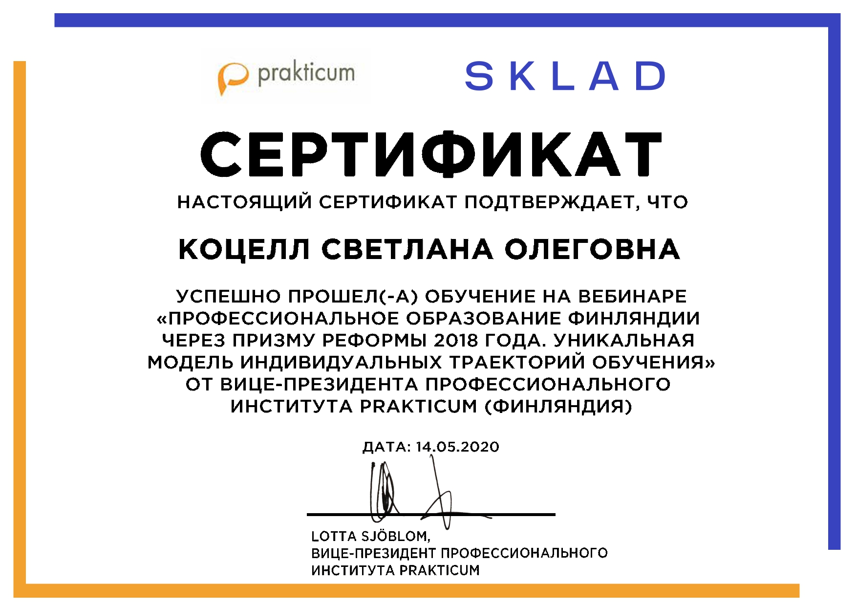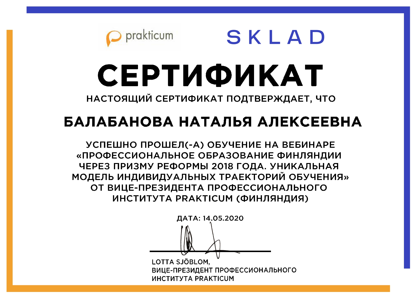Агенство Международных образовательных программ «Эду Трэвел», Образовательная платформа SKLAD 14 мая 2020г. провела вебинар на тему: «Профессиональное образование Финляндии через призму реформы 2018 года. Уникальная модель индивидуальных траекторий обучения», в котором приняли участие преподаватели колледжа: Балабанова Н.А., Сулейменова Д.Ж., Коптлеу А.Б., Дикун Е.В., Сейтмагамбетова А.Б., Манашова Л.Ж., Коцелл С.О., Медеубекова А.О., Зверховская О.А., Бисенова А.Т.Участники вебинара получили сертификаты.