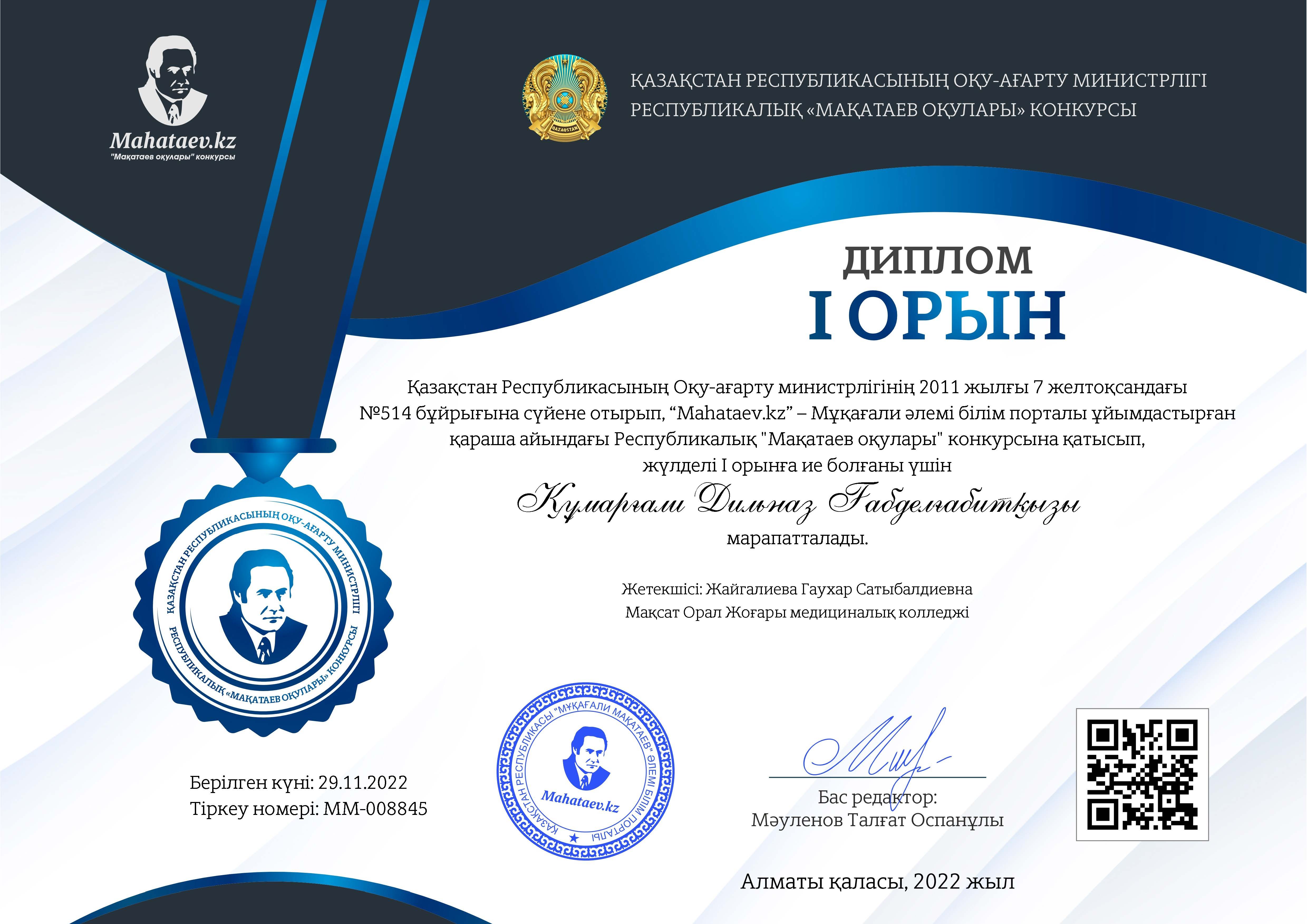 В целях пропаганды творчества Мукагали Макатаева среди обучающихся, раскрытия их мотивации и требований к чтению стихов, а также повышения художественного мастерства на ноябрьском республиканском конкурсе «Макатаевские чтения», организованным образовательным порталом мир Мукагали - «Mahataev». KZ под руководством преподавателя казахского языка и литературы Г. Жайгалиевой приняли участие студенты группы Ф-01 по специальности "Лечебное дело" Сейтонов Аршат, Султанов Ибат, Темрболатова Бибигуль, студентка группы МС-21 специальности «Сестринское дело» Кумаргали Дильназ и заняли І, ІІ призовые места.