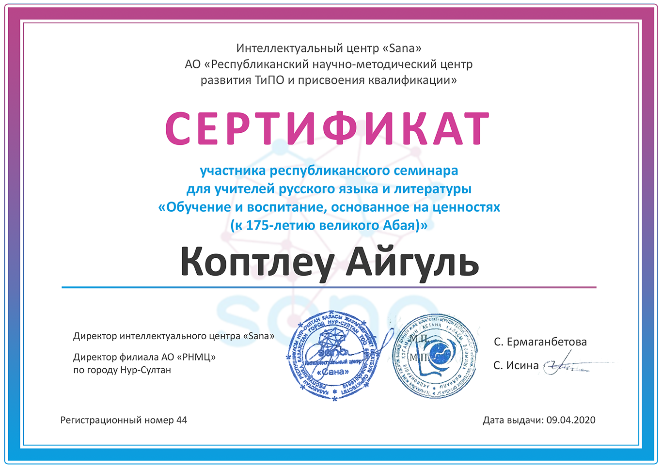 Интеллектуальным центром «Sana» был организован республиканский онлайн семинар для учителей русского языка и литературы на тему: «Обучение и воспитание, основанное на ценностях (к 175- летию великого Абая)», в котором приняли участие преподаватели колледжа Коптлеу А.Б. и Коцелл С.О.