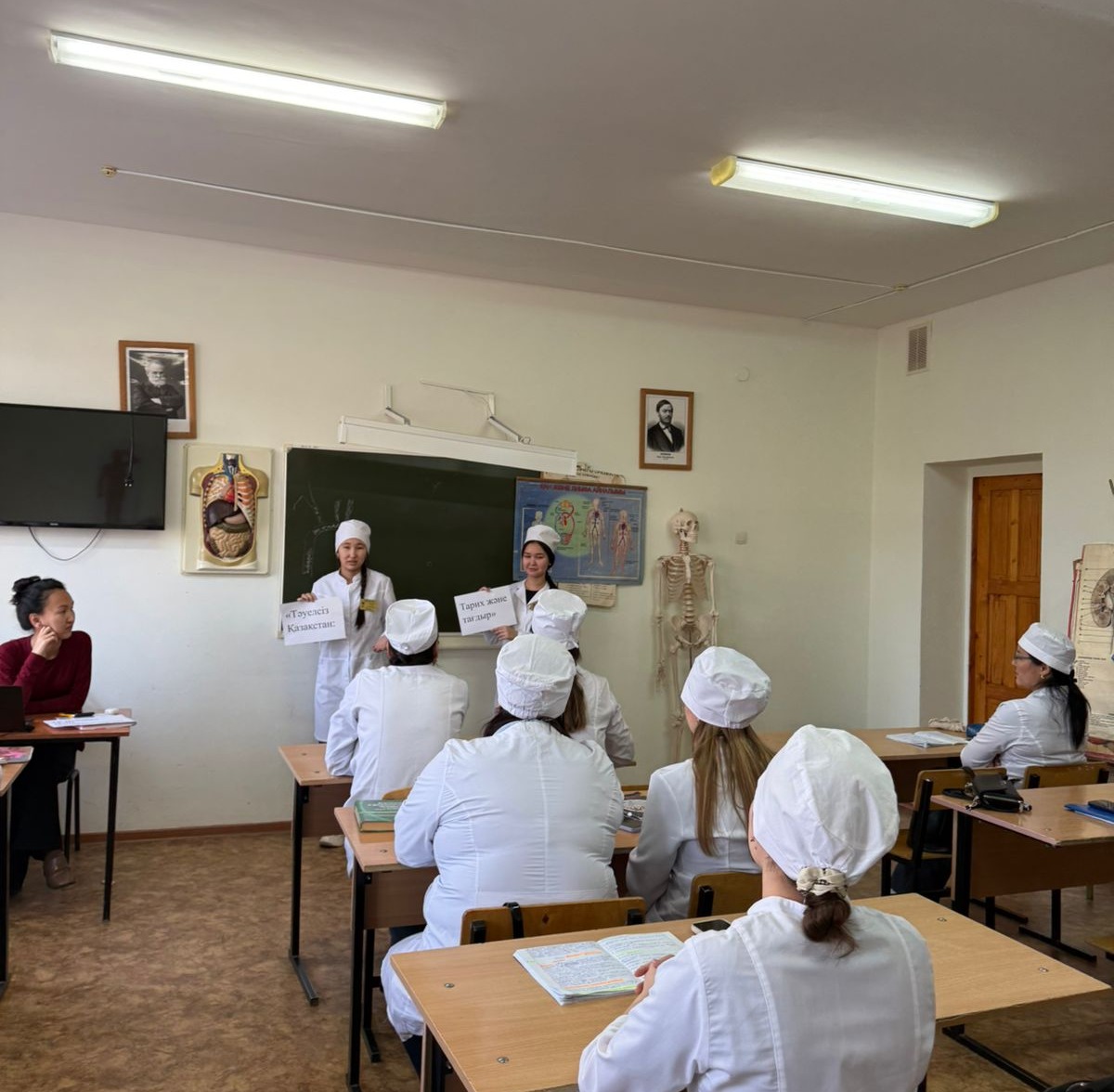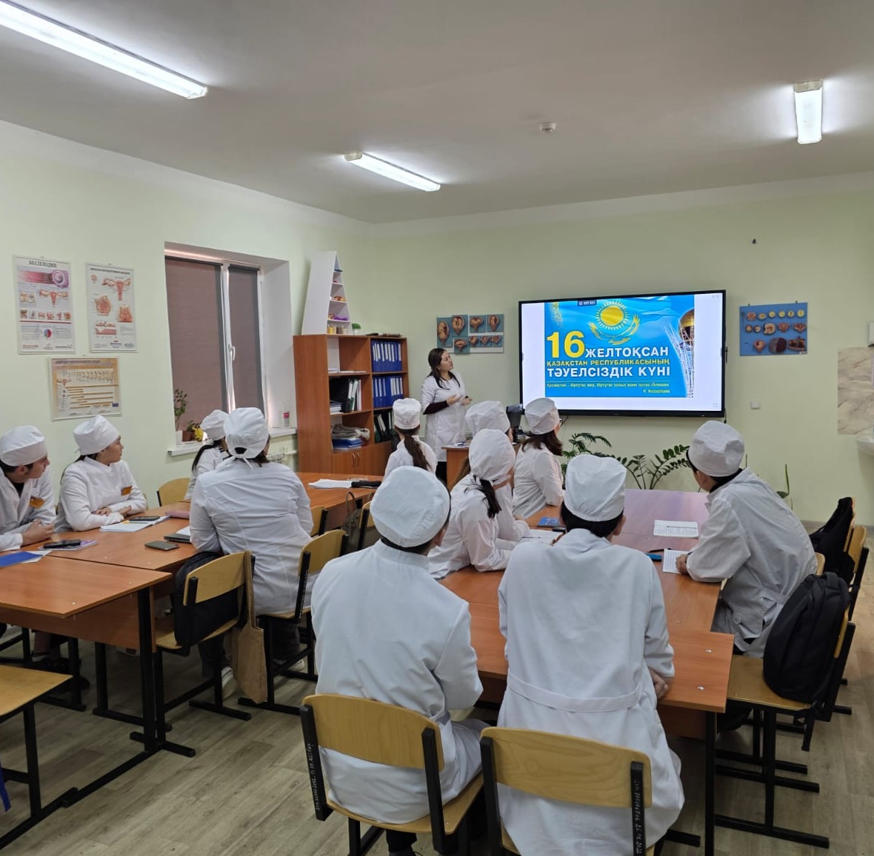 Цель воспитательного часа – формирование у студентов патриотических чувств, воспитание любви к Родине, углублённое понимание истории пути Казахстана к независимости, развитие активной гражданской позиции и ответственности за судьбу страны, уважение к государственным символам, национальным ценностям и традициям, а также воспитание сознательной, ответственной и духовно развитой молодёжи.