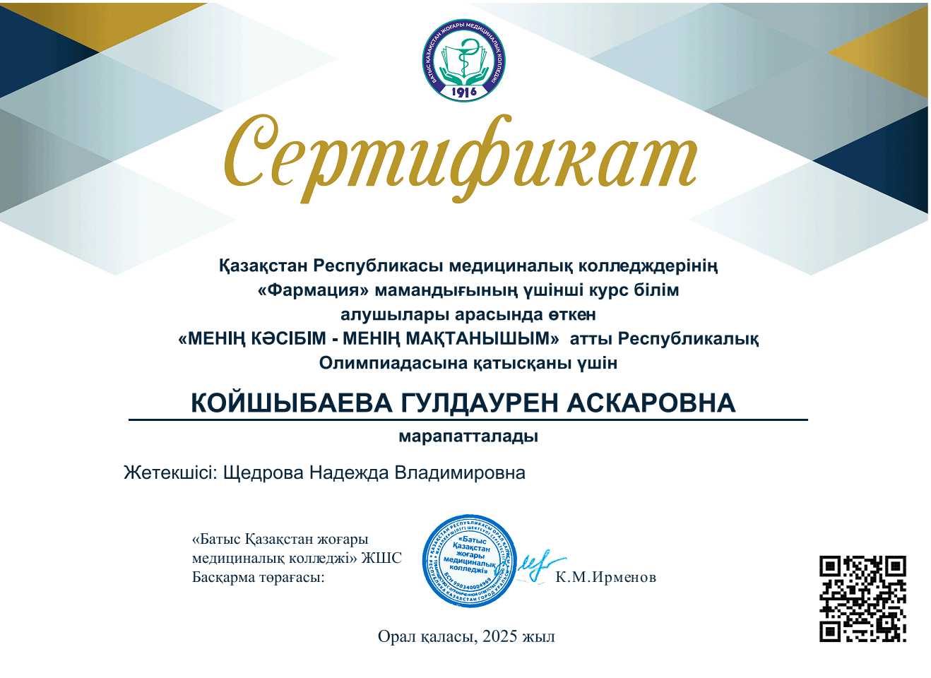 Студентка отделения «Фармация» показала высокий результат на Республиканской олимпиаде