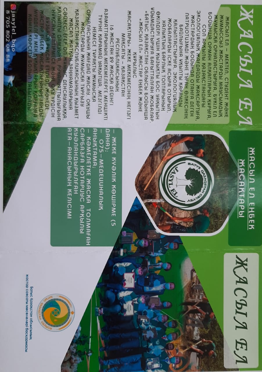 Управление по вопросам молодежной политики ЗКО провели встречу руководителей трудовых отрядов «Жасыл ел» со студентами колледжа. Работа "Жасыл ел" направлена на сезонное трудоустройство студенческой и безработной молодежи по созданию лесных массивов ЗКО, тем самым улучшая экологическую обстановку в области, а так же формировать у молодежи патриотизма к Родине и бережного отношения к богатству родного края. Программа озеленения «Жасыл ел» начнет свою деятельность с 1 июля 2022 года. Цель программы-привить подрастающему поколению философию "трудись, трудись, трудись".