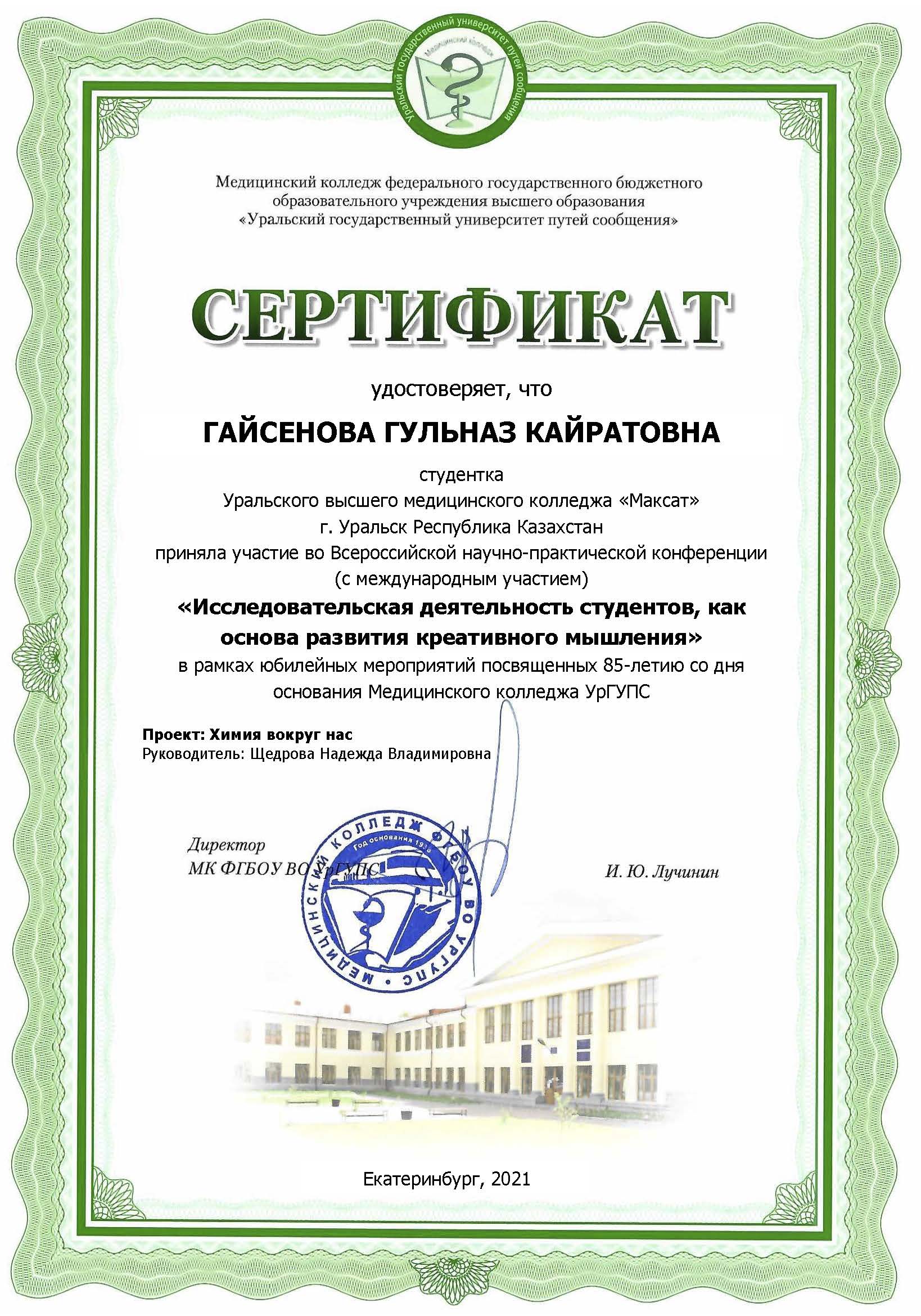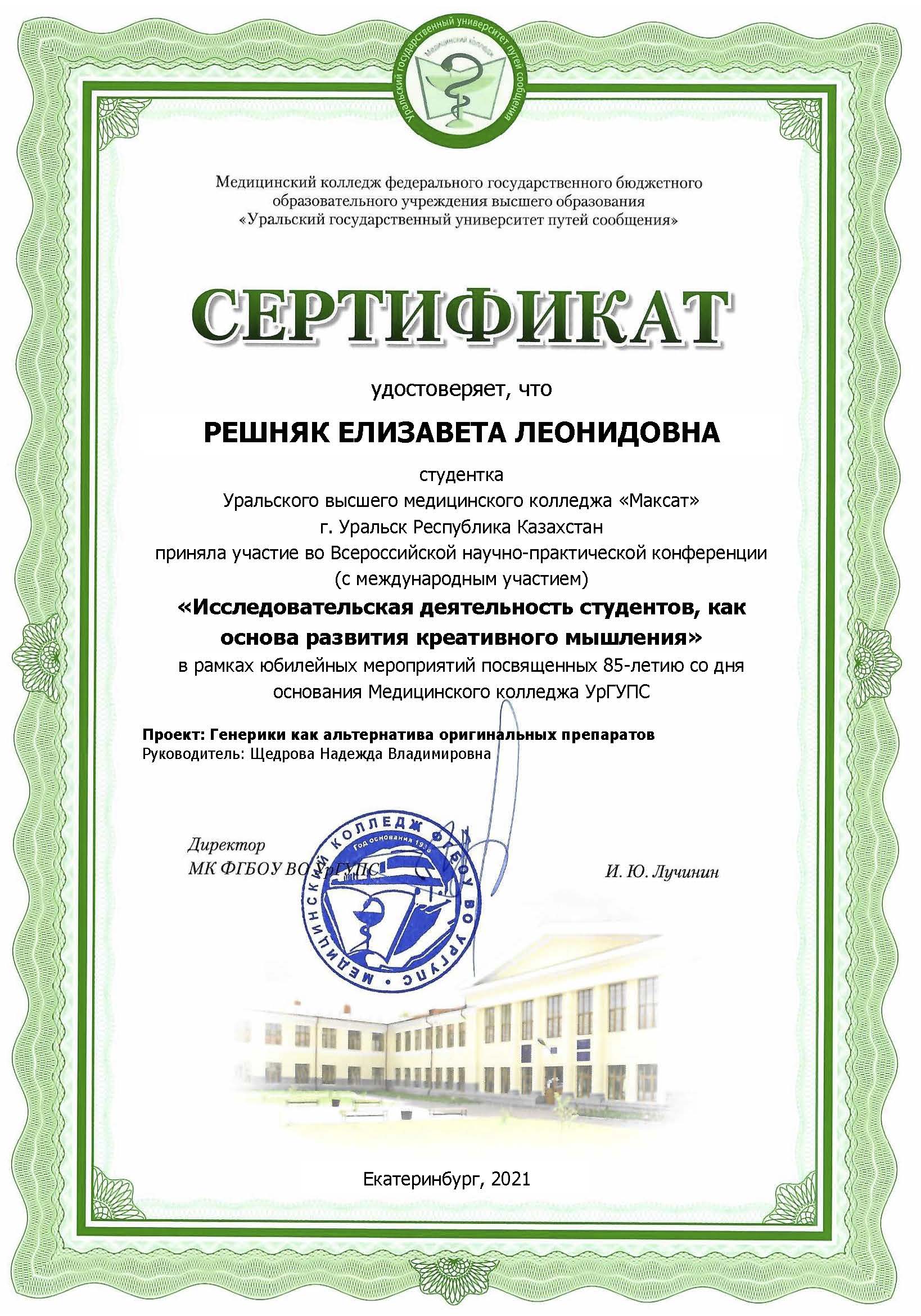 Кроме того, в этой же конференции приняли участие студентки специальности «Фармация» Гайсенова Гульназ (проект «Химия вокруг нас») и Решняк Елизавета (проект «Генерики как альтернатива оригинальных препаратов»).Участницам и преподавателю фармацевтических дисциплин Щедровой Надежде Владимировне вручены сертификаты и Благодарность.