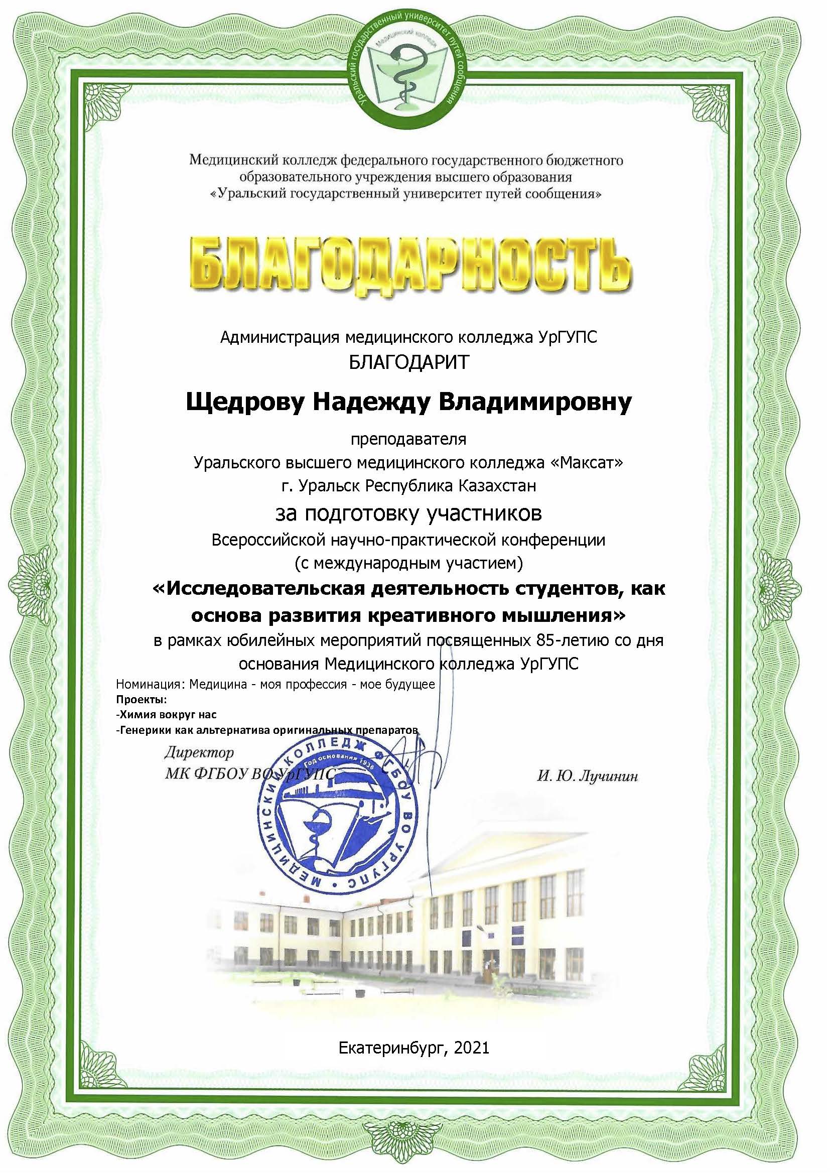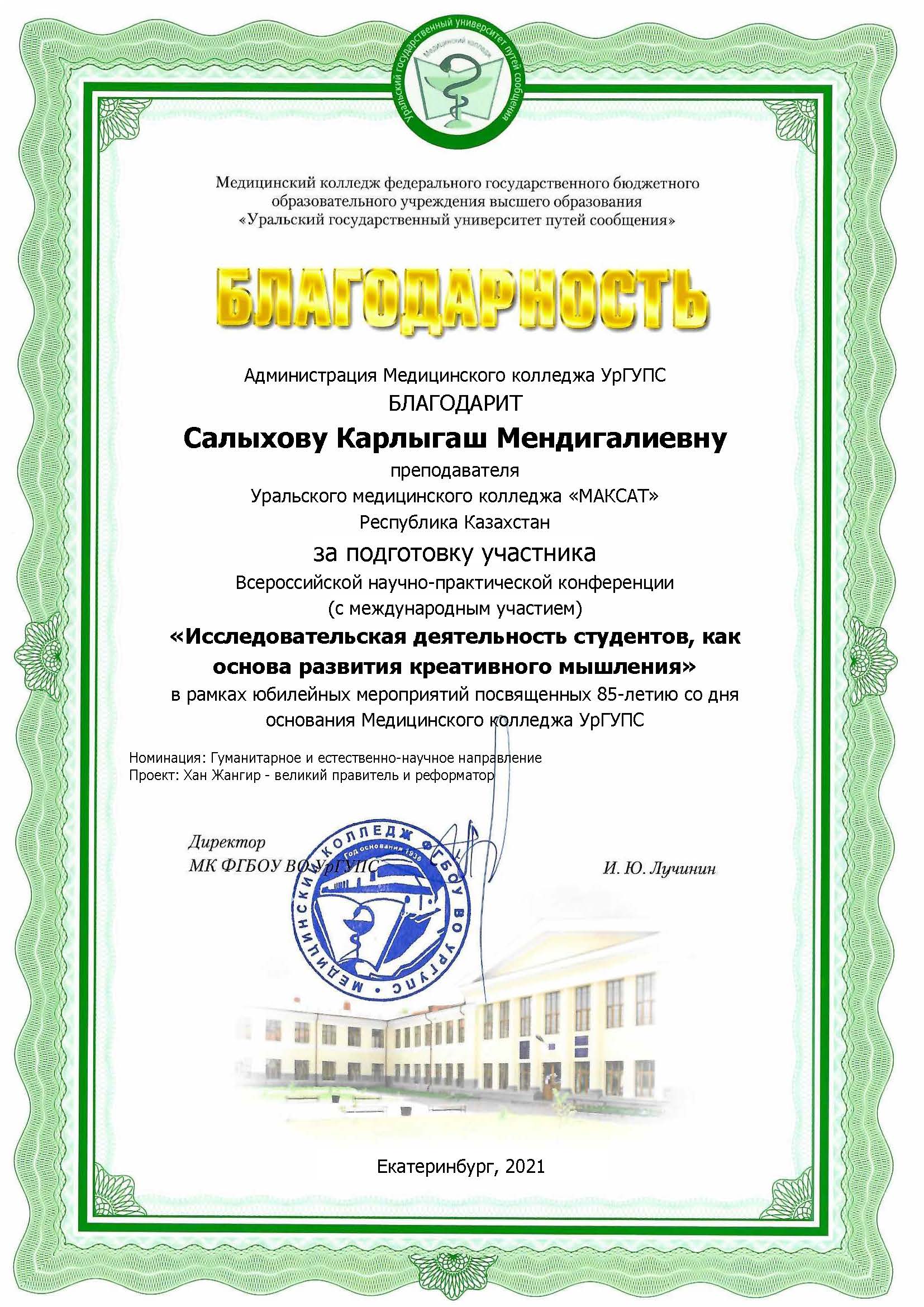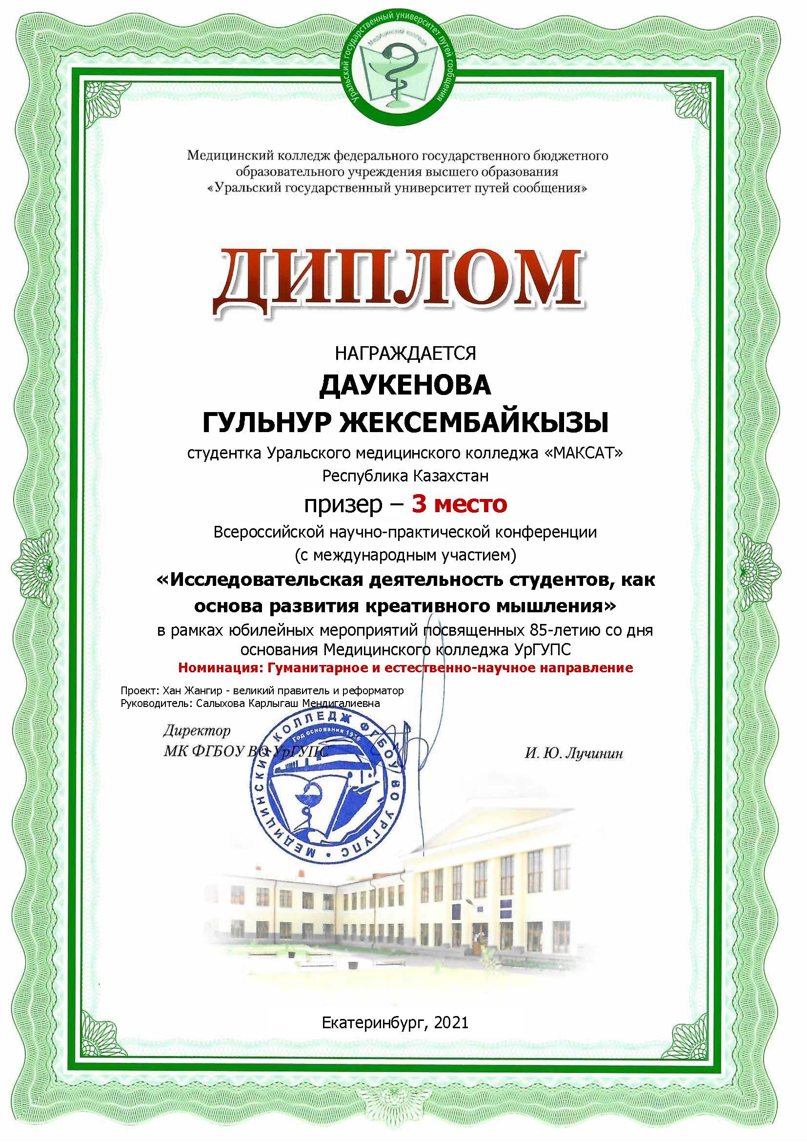 В рамках юбилейных мероприятий, посвященных 85-летию со дня основания Медицинского колледжа УрГУПС, была проведена научно-практическая конференция «Исследовательская деятельность студентов, как основа развития креативного мышления».В номинации «Гуманитарное и естественно-научное направление»приняла участие студентка І курса специальности «Лечебное дело» Даукенова Гульнур Жексембайкызы с проектом «Хан Жангир - великий правитель и реформат».Руководитель: преподаватель истории Салыхова Карлыгаш Мендыгалиевна.