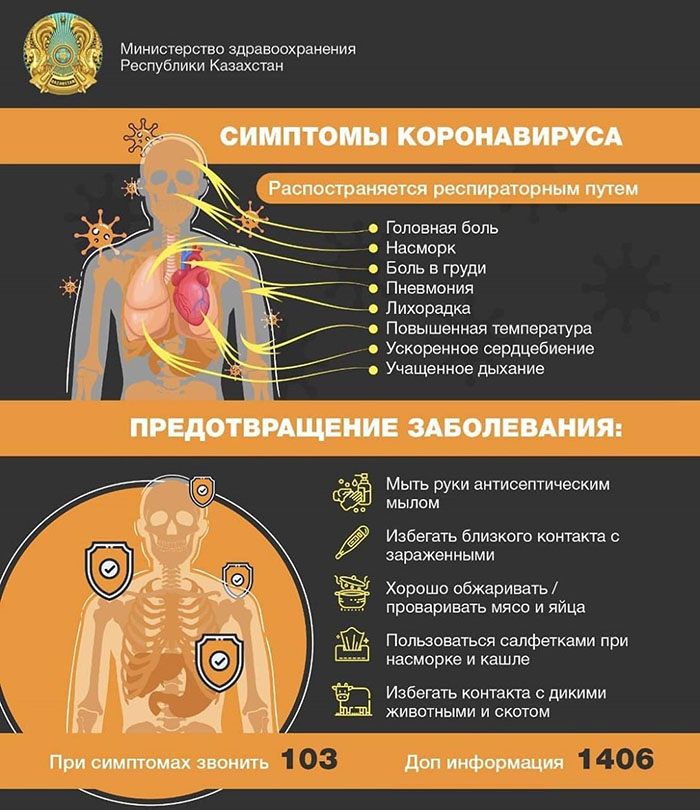 Уважаемые казахстанцы, Министерство здравоохранения Казахстана просит всех прибывших из Китайской Народной Республики при появлении симптомов коронавируса в течение 14 дней после поездки, позвонить своему участковому врачу по месту жительства для регистрации и медицинского наблюдения.