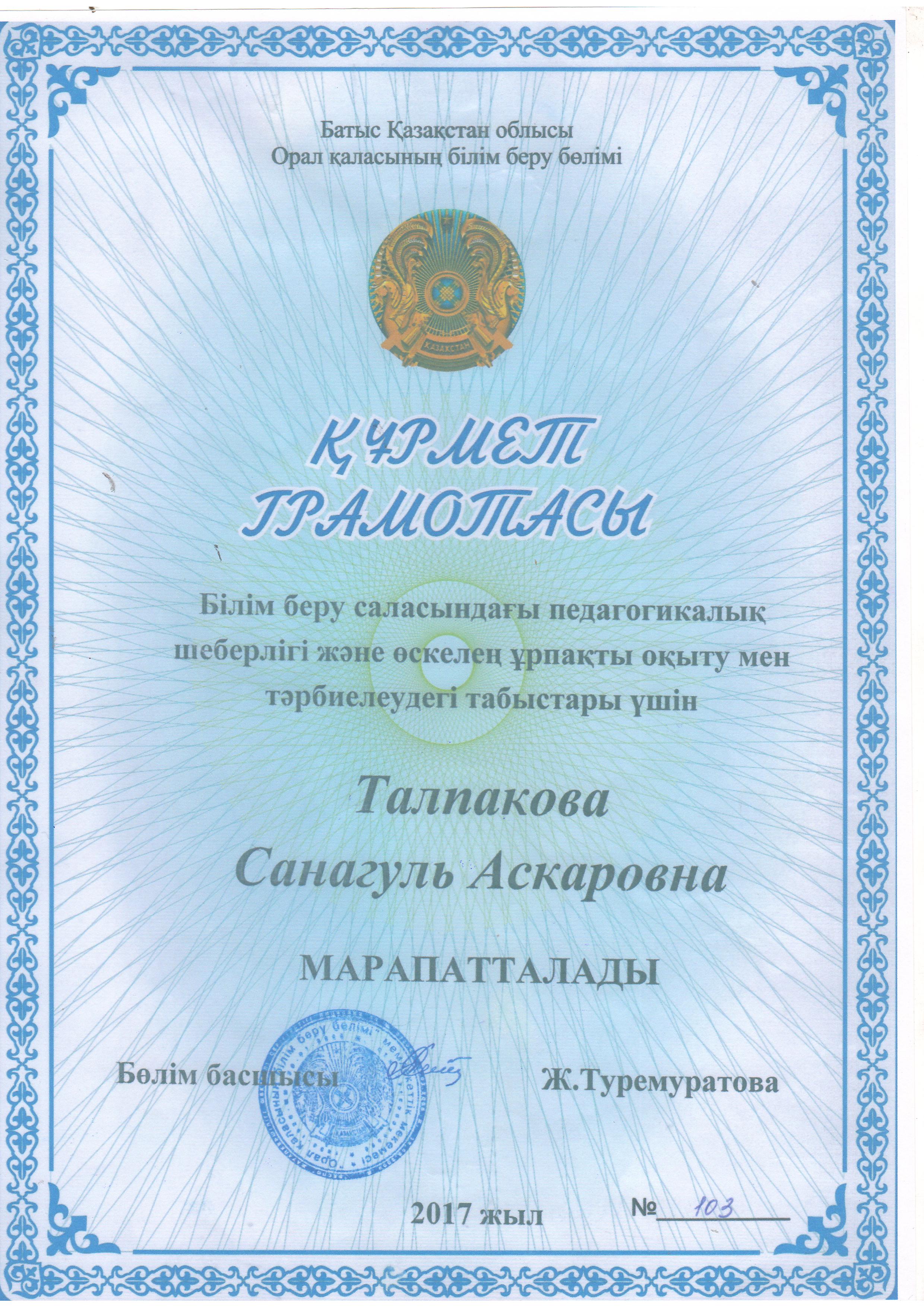Почетная Грамота. Уральск, 2017г. Уральский городской отдел образования