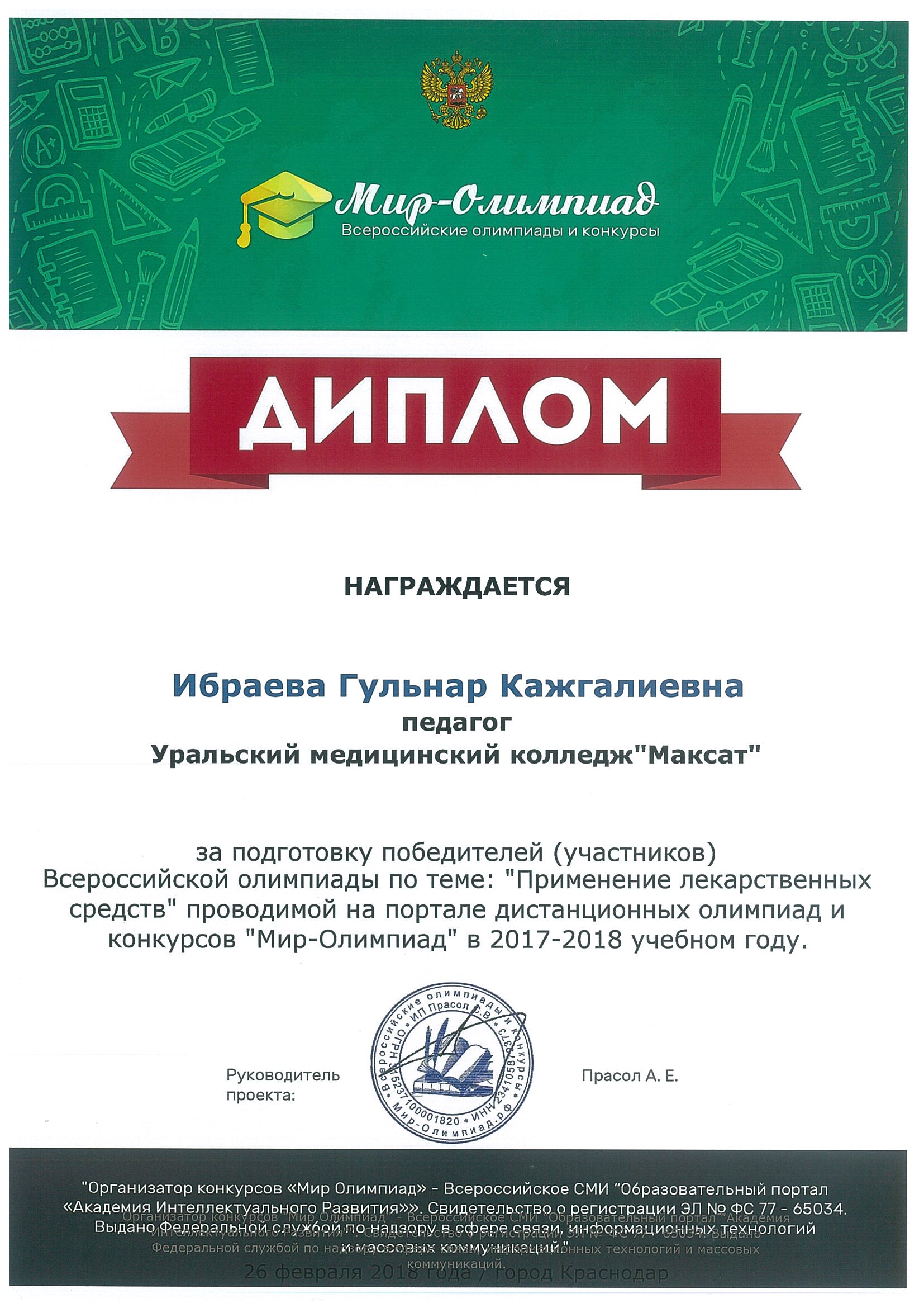 Всероссийский конкурс «Мир олимпиад» среди студентов по предмету фармакологии. Подготовила Ибраева Гульнар Кажгалиевна преподаватель фармацевтических дисциплин. 26.02. 2018г.